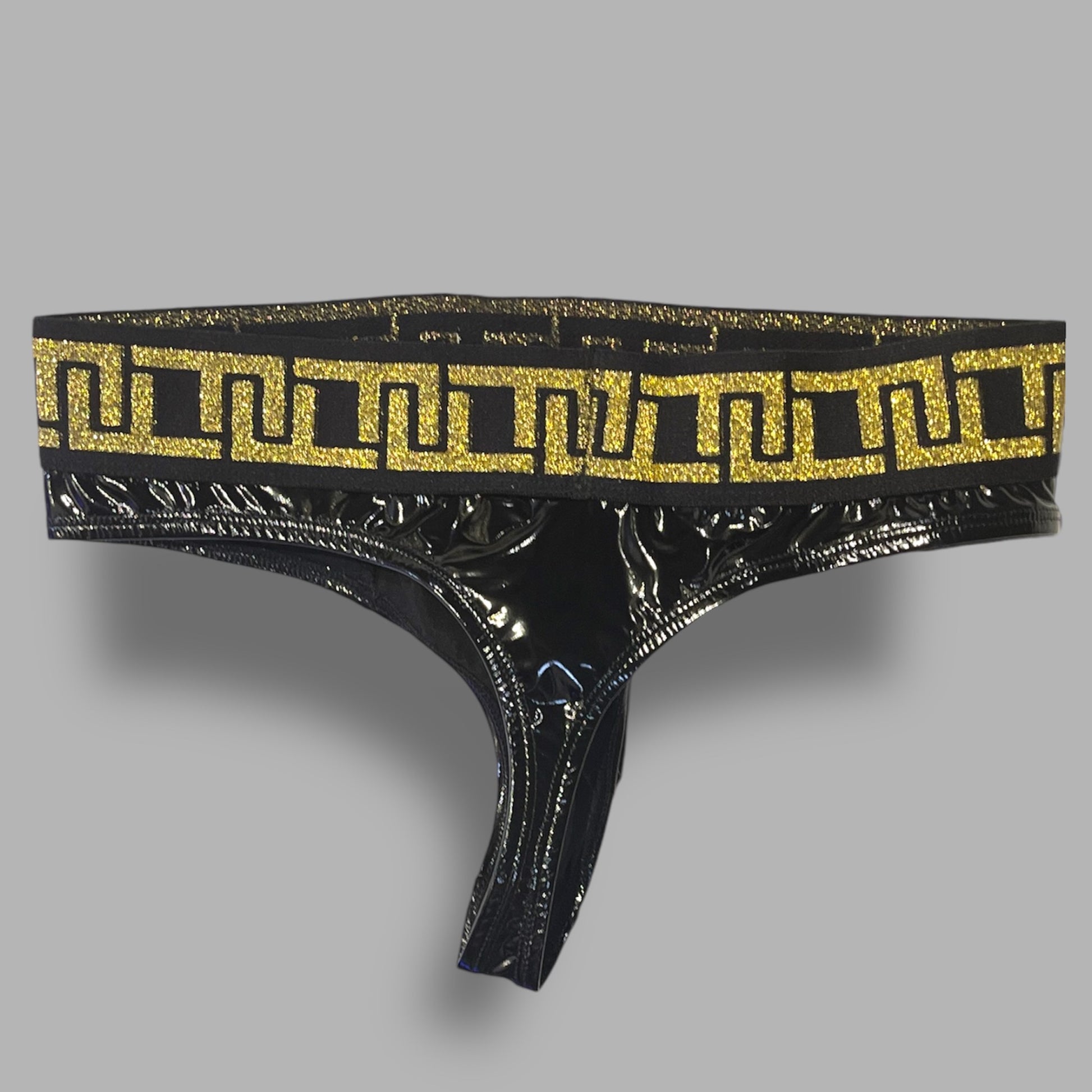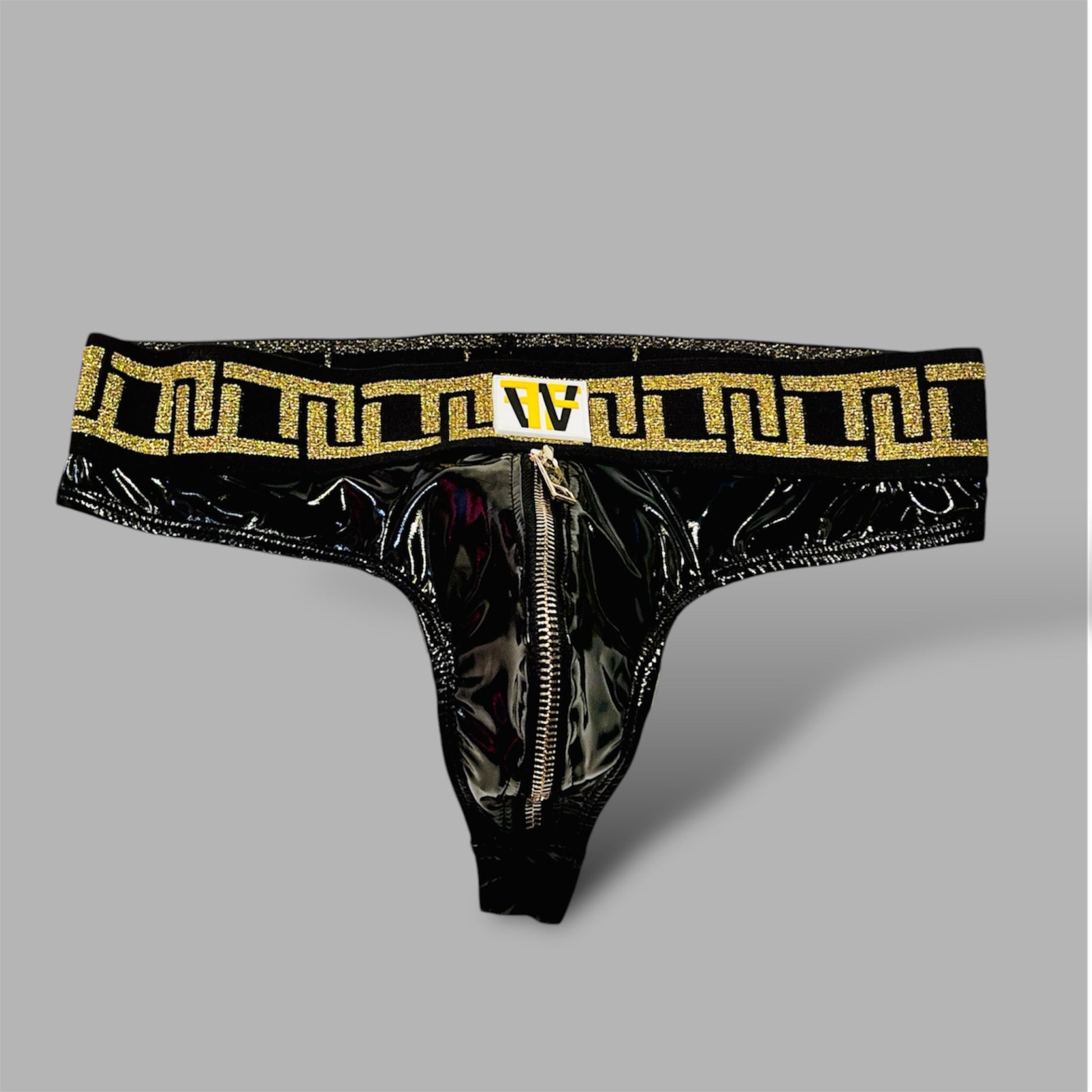 Indulge in the pinnacle of luxury with our exclusive 'The Majesty Men's Zipper Thong Underwear'. Crafted from premium black 'wet look faux leather' with a custom black and gold elastic, this piece offers a sleek design with a convenient zipper front. Perfect for any occasion, it provides an unmatched confidence boost, making you feel like royalty. Don't miss out on this limited edition piece - elevate your undergarment collection today!