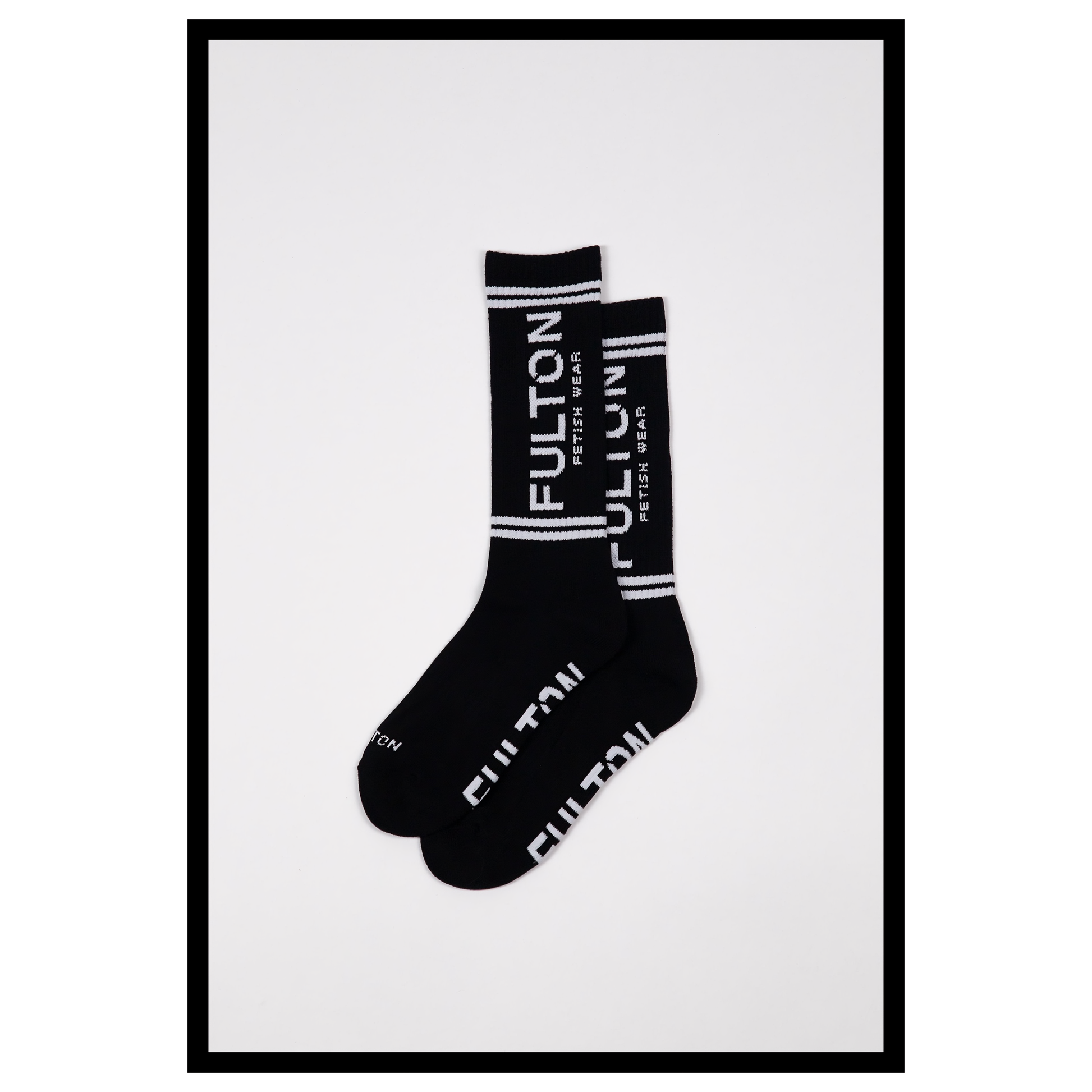Step up your sock game with the Sinister Socks in Black! These comfortable socks are crafted from high-quality materials, ensuring durability and a snug fit. The dark black Cotton Polyester Lycra fabric proudly features the Fulton name in a bold white font, complemented by horizontal stripes that add a vintage varsity gym sock vibe.