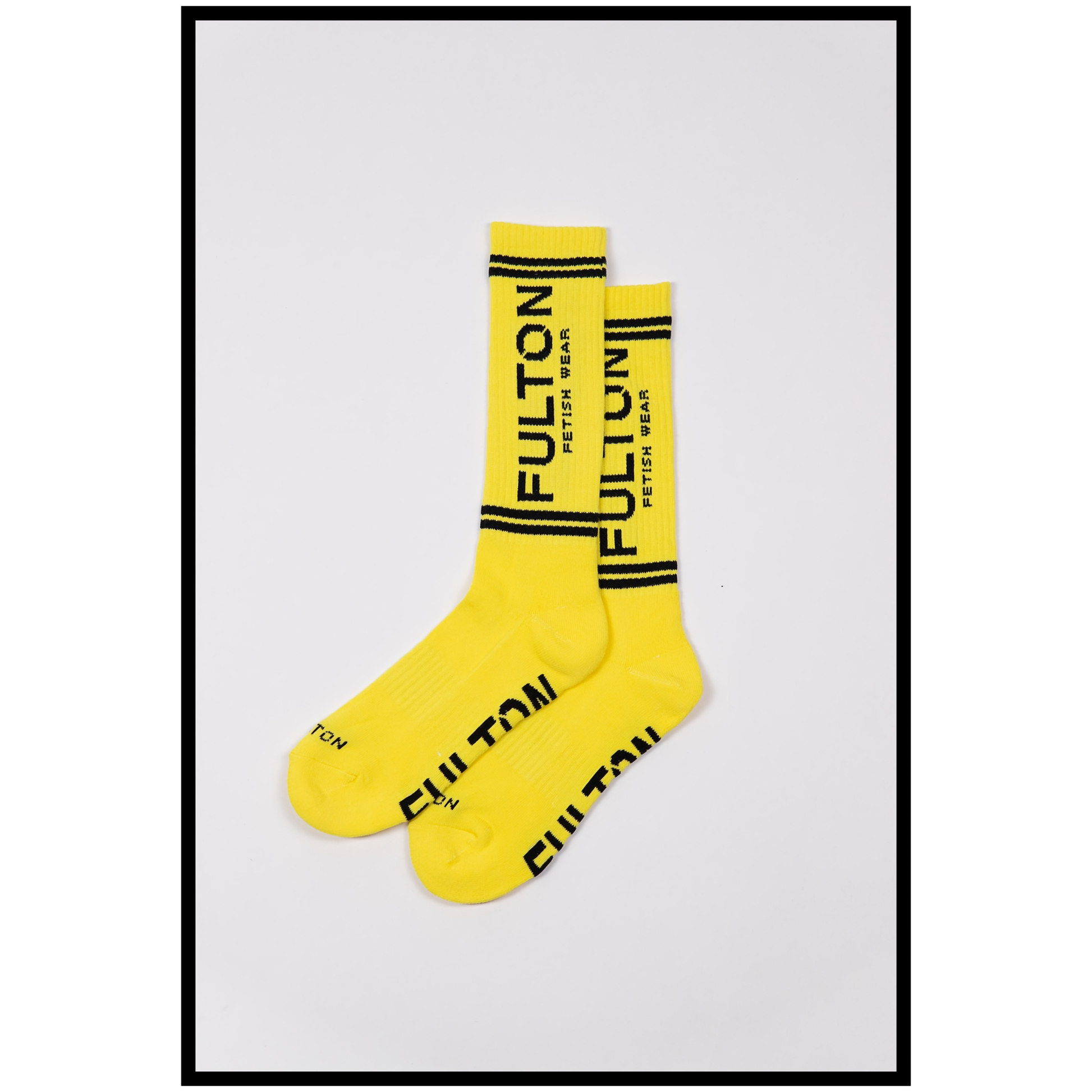 Step up your sock game with the Sinister Socks in Yellow! These comfortable socks are crafted from high-quality materials, ensuring durability and a snug fit. The vibrant Yellow Cotton Polyester Lycra fabric proudly features the Fulton name in a bold Black font, complemented by horizontal stripes that add a vintage varsity gym sock vibe.